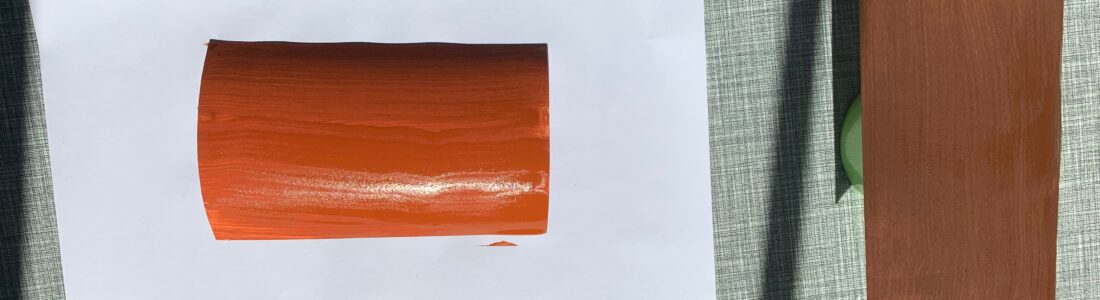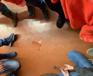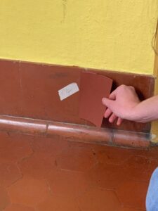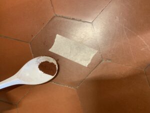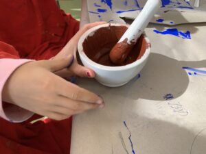 Danach wurden sie angeleitet ihre eigene Farbe herzustellen. In kleinen Gruppen versuchten sie die Farbe so zu mischen, dass sie dem Rot des Schulhausbodens möglichst nahe kamen.