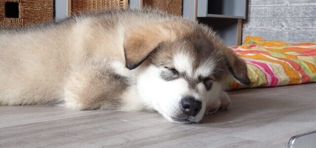 De har 46 slädhundar och en liten söt alaskan alamute valp som är nio veckor gammal. Deras överraskning till oss!