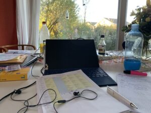 Med i mötet var Barbara, trebarnsmamma och lärarinna i tyska som främmande språk. Hon tycker att det var mycket utmanande de senaste veckorna, därför att hela familjen sitter och arbetar eller studerar hemma, men var och en har sitt eget schema. En son är med i distansundervisningen med delvis direkt lärarkontakt. De får till och med uppgifter i konstämnen: t. ex. olika ritningar av familjemedlemmar i home office! Dottern studerar och arbetar också hemma nu, men hon är mycket friare med tidsindelningen på arbetsdagarna än på skoldagarna, där lärarna ofta har direktkontakt med eleverna. För Barbara själv betyder de stängda skolorna att hitta på nån möjlighet att undervisa förskoleleverna i tyska, även om inte alla har stöd av föräldrarna. Det saknas till och med datorer hemma hos några familjer och så förstår ju inte alla föräldrar tyska. Därför var hennes första uppgift att ringa till alla 27 elever respektive föräldrar och få reda på hur vardagen ser ut där hemma nu, om det över huvud taget är realistiskt att övningar kan göras eller hur det ser ut med tekniska medel som laptop o.s.v. Sedan gällde det att kreera övningar på olika nivåer med anvisningar och ordlistor (skriftligt och som ljudfil). Det betyder också att översätta anvisningar på engelska, för att alla får chansen att förstå läxorna. Nu på den ”undervisningsfria tiden” under vårsemestern blir det dags att planera direkt-undervisning via videokonferenser.